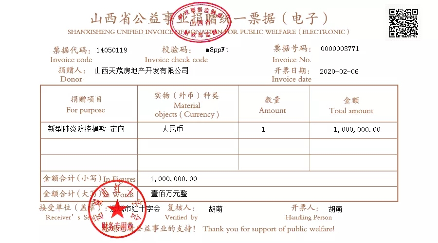 為了抗擊疫情、共渡難關(guān),西建集團(tuán)天茂房產(chǎn)通過運(yùn)城市紅十字會(huì)向“運(yùn)城市第二醫(yī)院(20萬元)、運(yùn)城市中心醫(yī)院(15萬元)、運(yùn)城市第一醫(yī)院(15萬元)、運(yùn)城市公安局鹽湖分局(10萬元)、芮城縣人民醫(yī)院(10萬元)、芮城縣中醫(yī)醫(yī)院(10萬元)、芮城縣疾病預(yù)防控制中心(10萬元)、芮城縣公安局(10萬元)”共捐贈(zèng)人民幣100萬元,用于我市新型冠狀病毒感染的肺炎疫情防控工作和其他公益事業(yè)。
