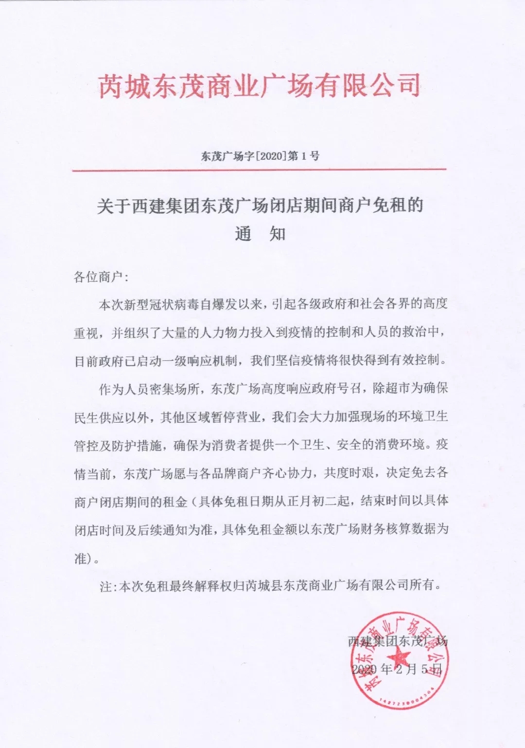 作為人員密集場所,隸屬西建集團(tuán)旗下的芮城縣東茂廣場高度響應(yīng)政府號召,除超市為確保民生供應(yīng)以外,其他區(qū)域已全部暫停營業(yè),大力加強(qiáng)現(xiàn)場的環(huán)境衛(wèi)生管控及防護(hù)措施,確保為消費(fèi)者提供一個(gè)衛(wèi)生、安全的消費(fèi)環(huán)境。疫情當(dāng)前,總公司從目前形勢出發(fā),決定免去各商戶閉店期間的租金,與眾商戶齊心協(xié)力,共克時(shí)艱。