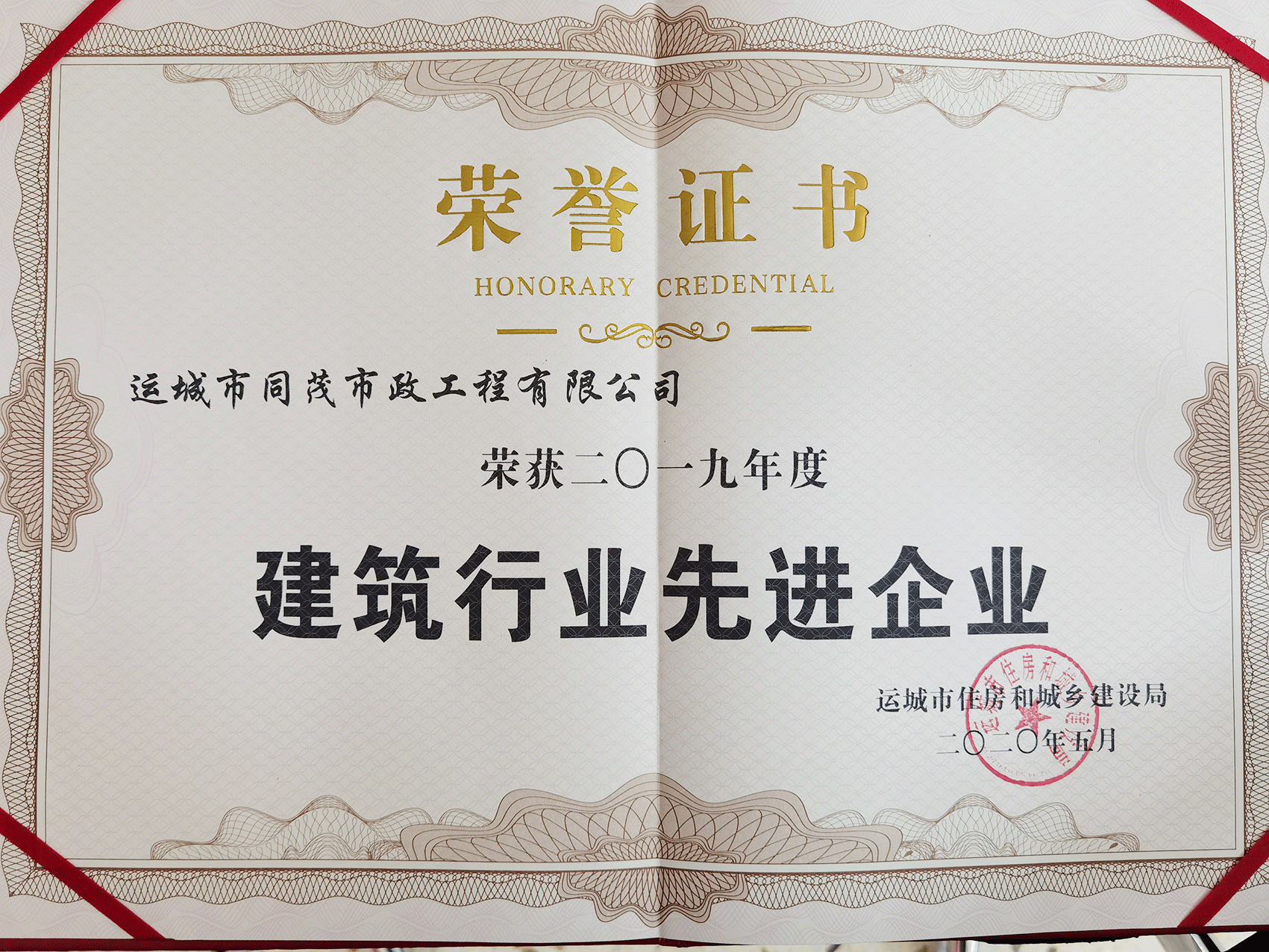 ▲運城市同茂市政工程有限公司榮獲“2019年度建筑行業(yè)先進企業(yè)”
