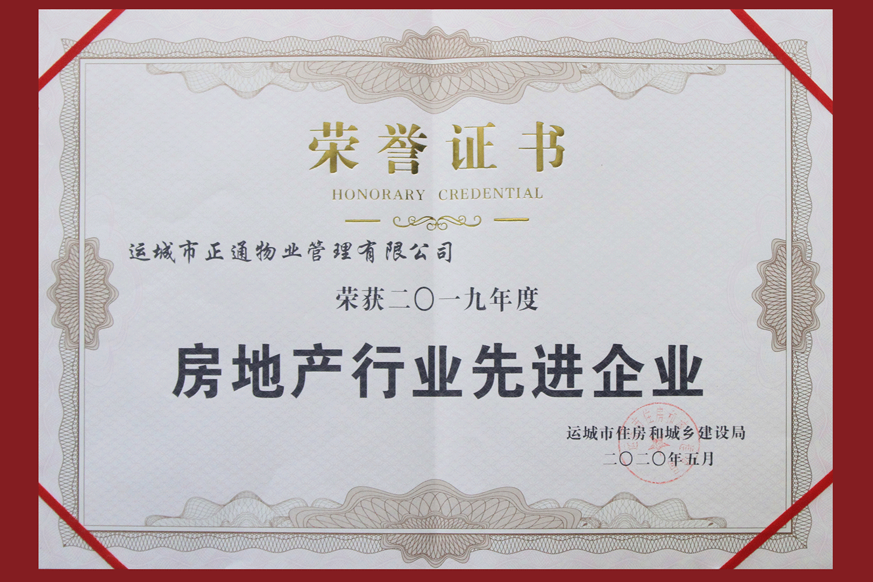▲運城市正通物業(yè)管理有限公司榮獲“2019年度房地產行業(yè)先進企業(yè)”