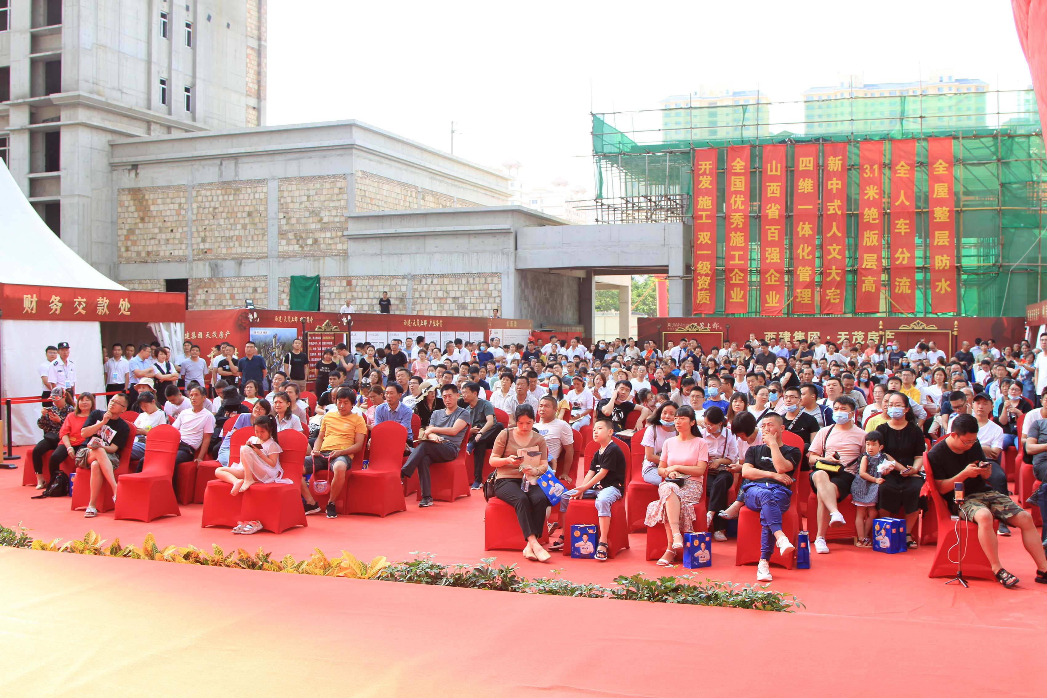 雖然天氣炎熱,但依然抵擋不住大家的熱情,開盤時間還未到,一支百人服務大隊整裝待發,早早守候在天茂上郡中央廣場會場內,靜待尊貴的客戶蒞臨。距離開盤還有一個小時,偌大的會場早已人聲鼎沸,大家早早趕來生怕與心儀房源失之交臂,眾多購房者翹首以盼,焦急地等候開盤儀式,共同見證西建·天茂上郡開盤的盛況。