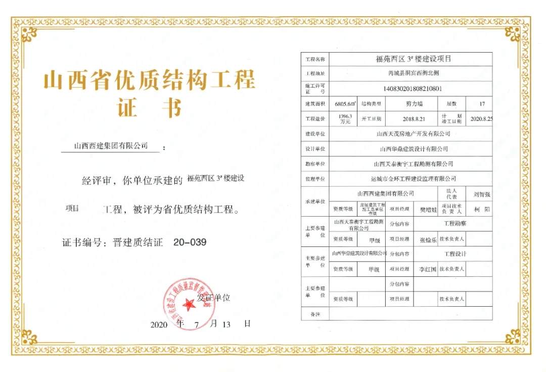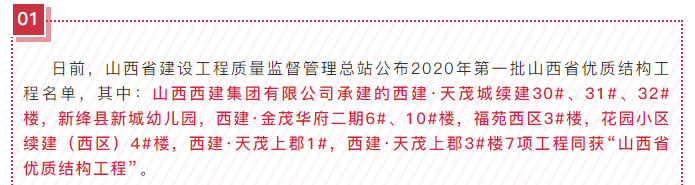 摘要:日前,山西省建設(shè)工程質(zhì)量監(jiān)督管理總站公布2020年第一批山西省優(yōu)質(zhì)結(jié)構(gòu)工程名單,其中:山西西建集團有限公司承建的西建·天茂城續(xù)建30#、31#、32#樓,新絳縣新城幼兒園,西建·金茂華府二期6#、10#樓,福苑西區(qū)3#樓,花園小區(qū)續(xù)建(西區(qū))4#樓,西建·天茂上郡1#,西建·天茂上郡3#樓7項工程同獲“山西省優(yōu)質(zhì)結(jié)構(gòu)工程”。