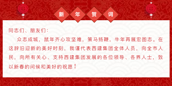 摘要:眾志成城,鼠年齊心攻堅難,策馬揚鞭,牛年再展宏圖志。在這辭舊迎新的美好時刻,我謹代表西建集團全體人員,向全市人民,向所有關心、支持西建集團發展的各位領導、各界人士,致以新春的問候和美好的祝愿!