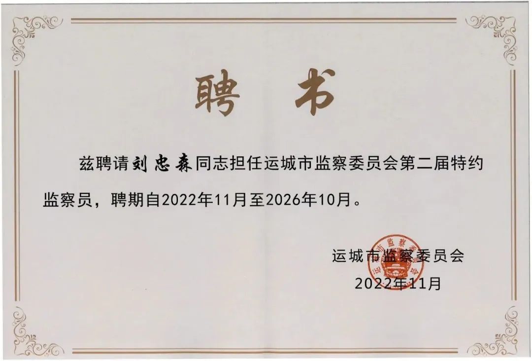 12月9日,市監(jiān)察委員會(huì)召開第二屆特約監(jiān)察員聘請(qǐng)會(huì)議,市委常委、市紀(jì)委書記、市監(jiān)委主任曹曉亮出席會(huì)議并講話。市政協(xié)委員、西建集團(tuán)天茂房產(chǎn)總經(jīng)理劉忠森參加會(huì)議,并被聘為運(yùn)城市監(jiān)察委員會(huì)第二屆特約監(jiān)察員。